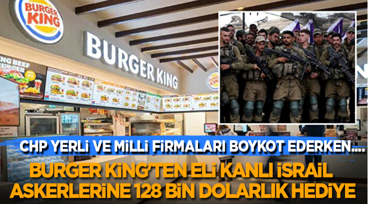 Bugün İsrail medyasına yansıyan habere göre; Burger King, Filistin'de katliam yapan İsrail ordusuna hediye yemek çeki dağıtacak. Burger King İsrail, İsrail askerlerine toplam değeri 480.000 İsrail Şekeli olan yemek kuponu dağıtacağını duyurdu.Yaklaşık değeri 128 bin ABD Doları olan 8 bin 727 adet ücretsiz hediye çeki eli kanlı orduya hediye olarak verilecek.