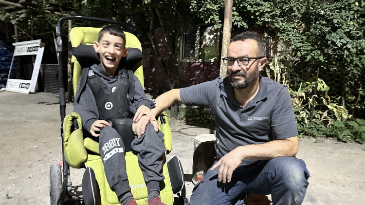 Hakkari'nin Yüksekova ilçesinde yaşayan Aydın Budak isimli fedakar baba, serebral palsi hastası olan 12 yaşındaki oğlunu mutlu etmek için kendi imkanlarıyla yaptığı ayakta durma sehpası ile onu mahalle mahalle gezdiriyor.
