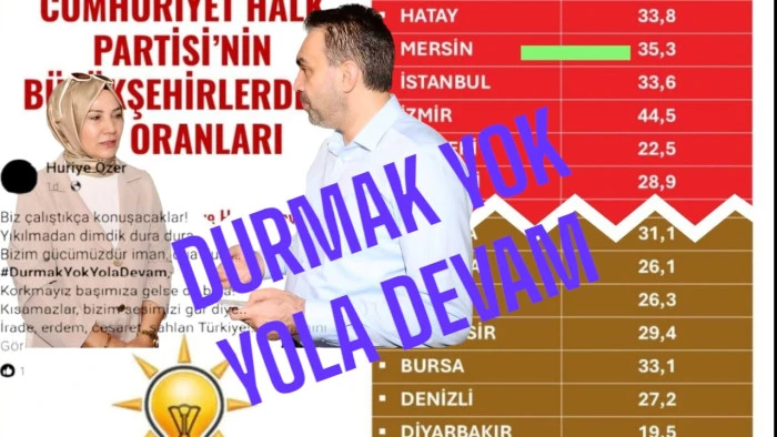 Güncel bir anket siyasi partilerin büyükşehirlerdeki oy oranları ile ilgili bir anket sonucu yayınlandı. Bu sonuca göre Mersin’de CHP oy oranı 35.3 iken Ak Parti oy oranı 22.4. Mersin’de Ak Parti teşkilatının yetersizliği, milletvekilleri arasındaki uyumsuzluk, boy boy resim paylaşımlarına halkın tepkisinin bu sonuçta etkili olduğu değerlendirilmektedir.